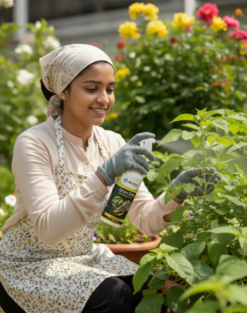 - Spray directly on leaves (top & underside), stems, and surrounding soil.
